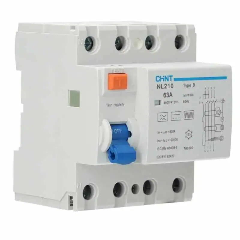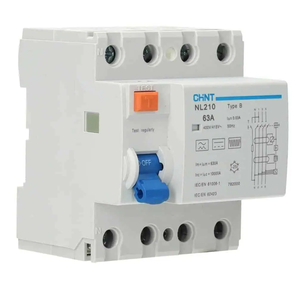 De CHINT differentieelschakelaar 4P 40 A 30 mA Type B biedt geavanceerde aardlekbeveiliging in driefasige installaties. In tegenstelling tot Type AC/A detecteert Type B ook gladde (zuivere) DC-lekstromen en hogere frequenties. De 30 mA gevoeligheid is bedoeld voor persoonsbeveiliging op eindkringen waar elektronisch gestuurde lasten aanwezig zijn.